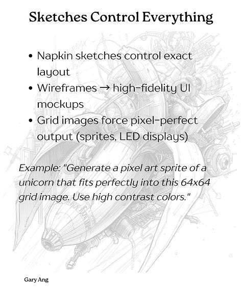 1️⃣ Use sketches to control layout - Upload a napkin drawing or wireframe to control where elements sit in the final output, not just as style reference.