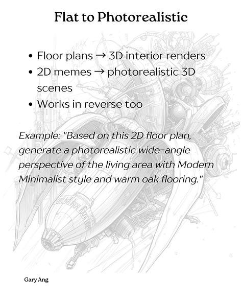 3️⃣ 2D to 3D translation - Feed a floor plan and get a photorealistic 3D interior render, or turn a 2D meme into a 3D scene. Works in reverse too.