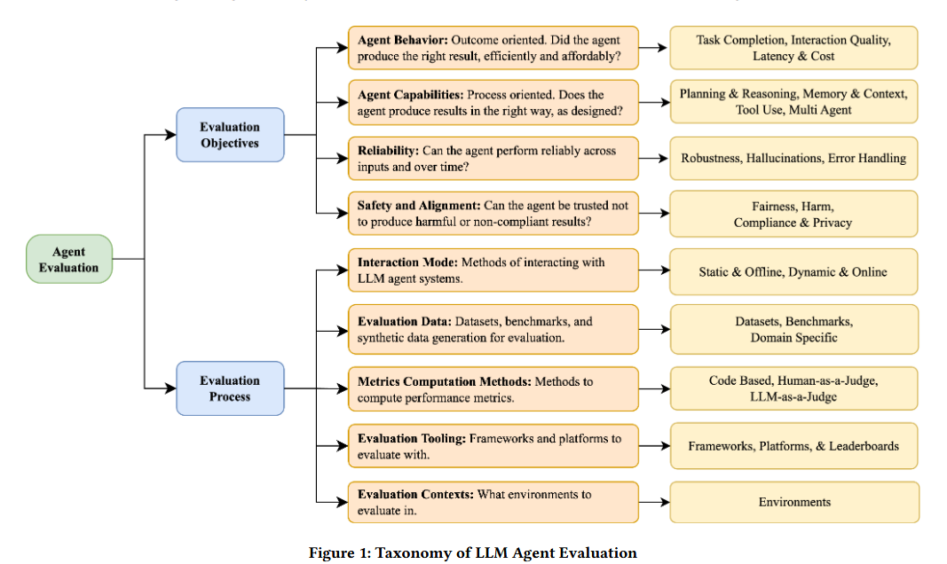 A taxonomy for agent evaluation, distinguishing between objectives (behavior, capabilities, safety) and process (static vs. dynamic). Covers the “What” (assessing agent behaviour, capabilities, reliability, safety & alignment), the “How” (static testing with datasets, dynamic testing with simulations, benchmarks, code-based, LLM as judge and human in loop evals). Also interesting in covering enterprise hurdles - role-based access controls, reliability guarantees, long horizon performance, policy compliance. The taxonomy presented in Figure 1 is excellent. (https://arxiv.org/pdf/2507.21504)