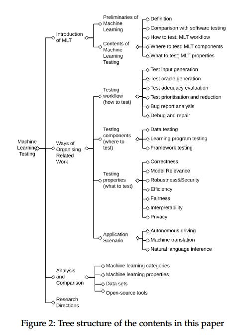 A comprehensive map of the territory before Generative AI made things a lot more complex. It breaks testing down into properties (correctness, robustness, fairness), components (data, learning program, framework) and workflows. I like their categorization of functional properties (correctness, model relevance) and non-functional properties (robustness, fairness, privacy, interpretability, efficiency). Even back then, it highlighted that testing techniques for unsupervised, transfer and reinforcement learning needed more work (https://arxiv.org/pdf/1906.10742v2)