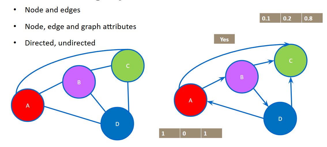 First, nodes and edges can have attributes. And not just simple attributes like the name or color of a node, but attributes that can be of any data type. Node and edges can be associated with numerical or categorical data, text or image data, or even time-series or multimodal data.